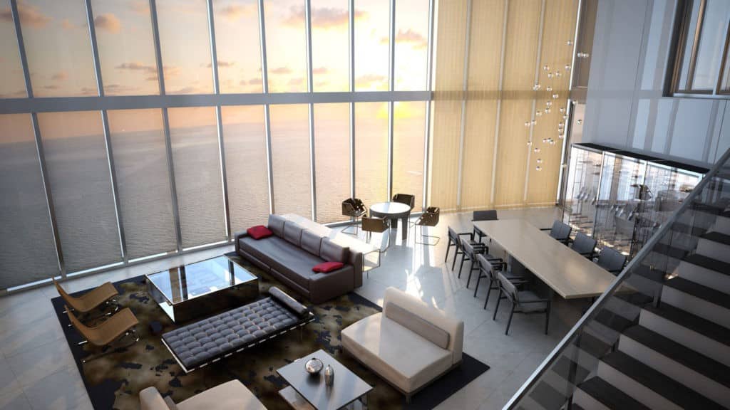 Natural colors and minimalistic patterns inside each residence put together by Porsche Design contribute to the sophisticated atmosphere of a lavish beachfront residence coupled with high-end resort-like amenities, which include 24-hour valet and concierge services, a heated outdoor swimming pool, and a high-tech world-class spa.